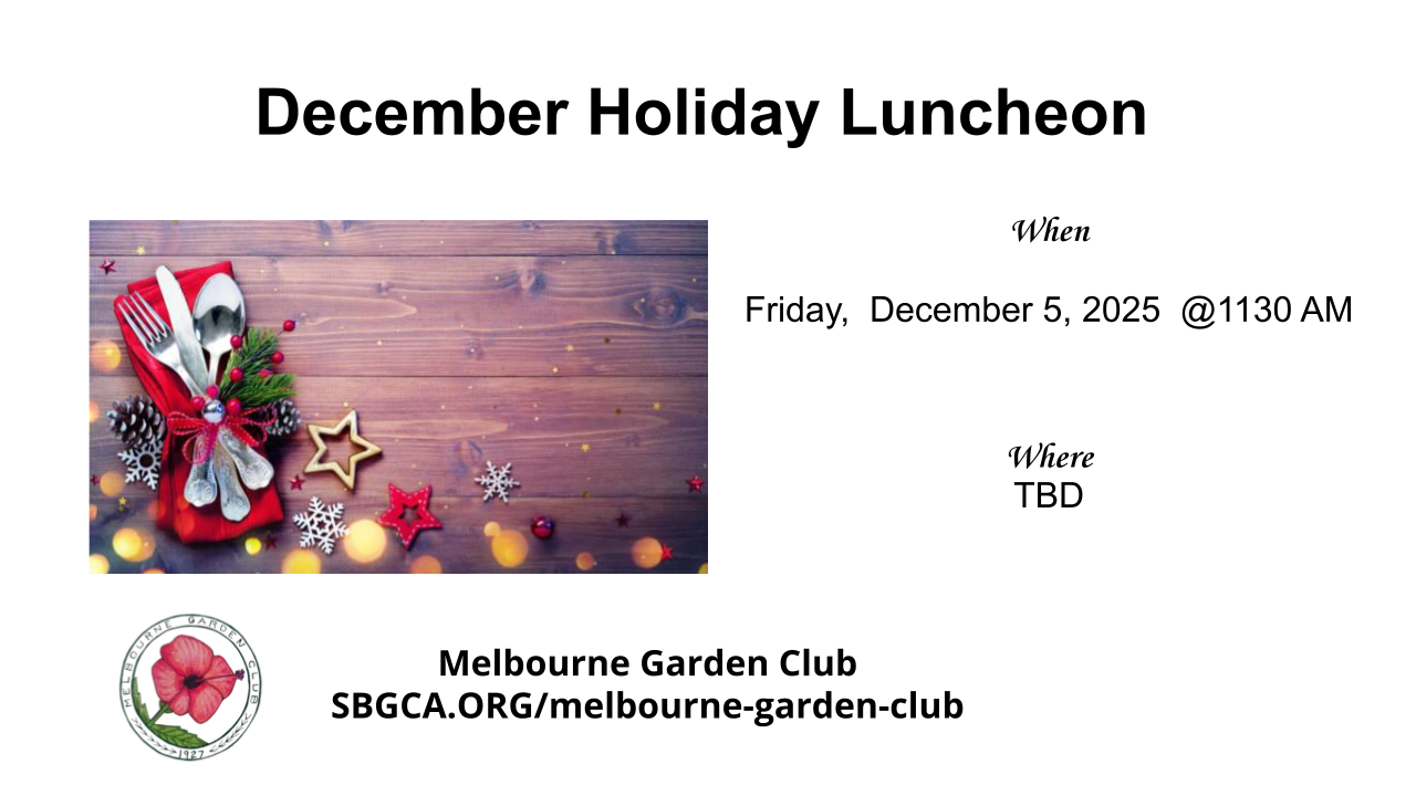 The mission of the Melbourne Garden Club is to further the education of its members and the public in the fields of gardening, horticulture, botany, floral design, landscape design, and environmental awareness, and to instill in our youth and community the love of gardening and respect for and protection of the environment. Members enjoy educational monthly programs, field trips, workshops, and plant exchanges.