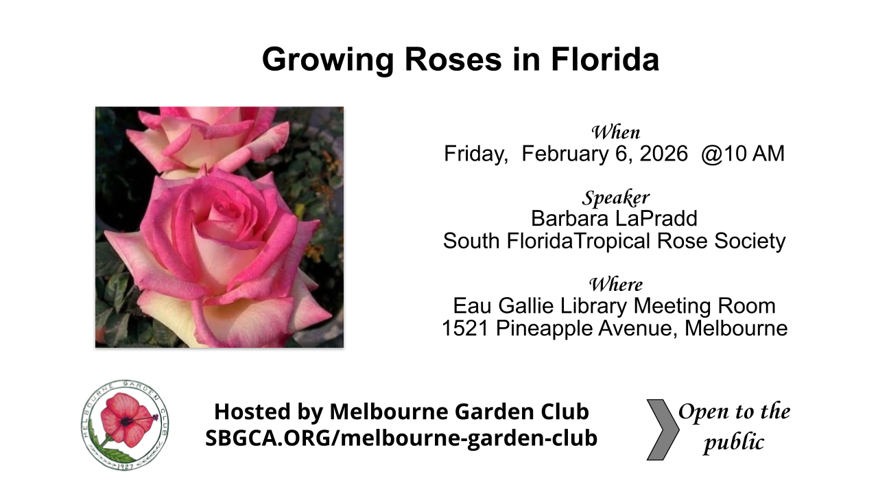 WE START our meeting at 9:30 am catching up with fellow members and greeting guests, and then our program of fascinating presenters starts at 10:00 am. After the program, we have a general club business meeting. We adjourn at noon. After adjournment, we have an informal plant exchange in case members bring something from home to share. Some people then have lunch at a nearby Eau Gallie Arts District restaurant.